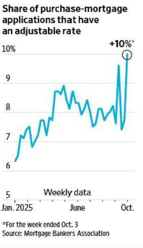 - About 10% of purchase mortgage applications were for ARMs in the week ended Oct. 3, the highest rate since 2023, according to the Mortgage Bankers Association. In early 2021, when mortgage rates were near historic lows, less than 3% of purchase applications were for ARMs.