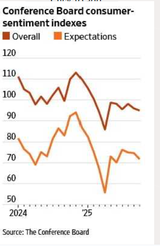 - Anxiety about tariffs, politics and inflation were at the forefront of consumers’ minds, Conference Board economist Stephanie Guichard said. “Comments remained mostly negative overall, but less so than in previous months” she said. “References to U.S. politics were up notably, with the ongoing government shutdown mentioned multiple times as a key concern.”