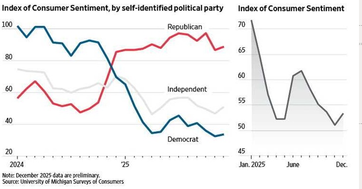 - The survey shows that the nation started the year in relatively decent spirits about the economy, with a reading above 70 in January. Nearly a year later, a preliminary monthly reading released in early December showed sentiment slightly above 53.