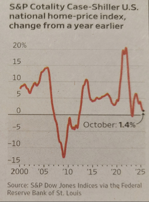 - The S&P Cotality Case-Shiller National Home Price Index rose 1.4% in the 12 months through October, compared with 1.3% increase in September. This resents weakest performance since mid-2023, partially blamingmortgage rates around 6%. This October reading represents less than 1/3of the 5.1% average home price increase recorded in 2024. When inflationis taking in to account, home values have had a slight decline in 2025.