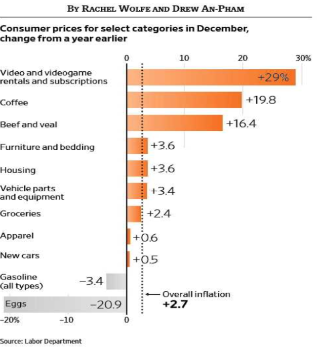 - Grocery prices are among Americans’ biggest gripes, with food-at-home prices up 2.4% from a year earlier in December, an acceleration from 2024’s increase of 1.8%.